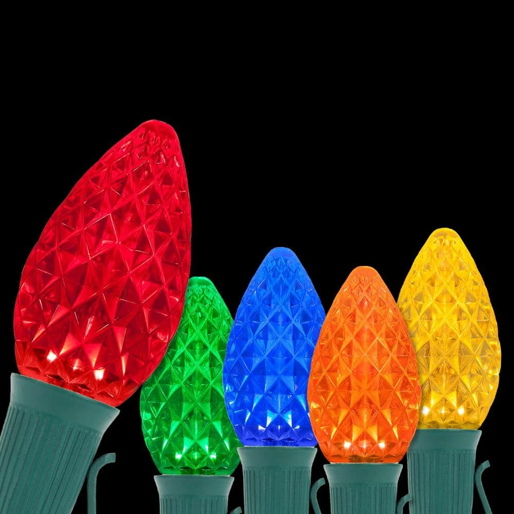 - 25 OptiCore C7 multi-color LED bulbs and one 25 ft. green E12 stringer with sockets spaced 12 in. apart, 6 in. leads with fused polarized male plugs, 6 in. tails with female plugs for end to end connections, 25 ft. total light kit length, to assemble, simply twist bulbs into sockets