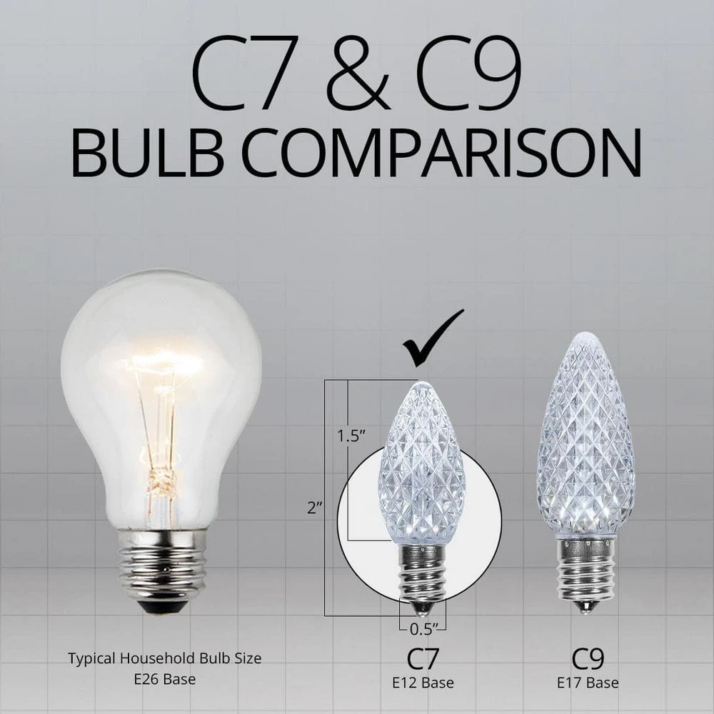 - Box of 25 cool white faceted C7 OptiCore LED Christmas light bulbs, E12 (candelabra) base; fits any standard C7/E12 sized socket