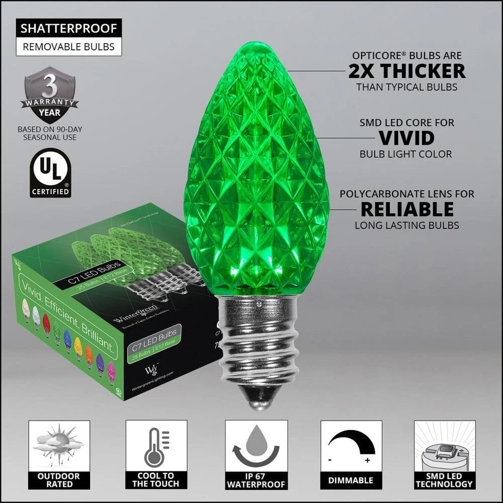 - Box of 25 C7 green faceted OptiCore LED Christmas light bulbs, E12 (candelabra) base; fits any standard C7/E12 sized socket