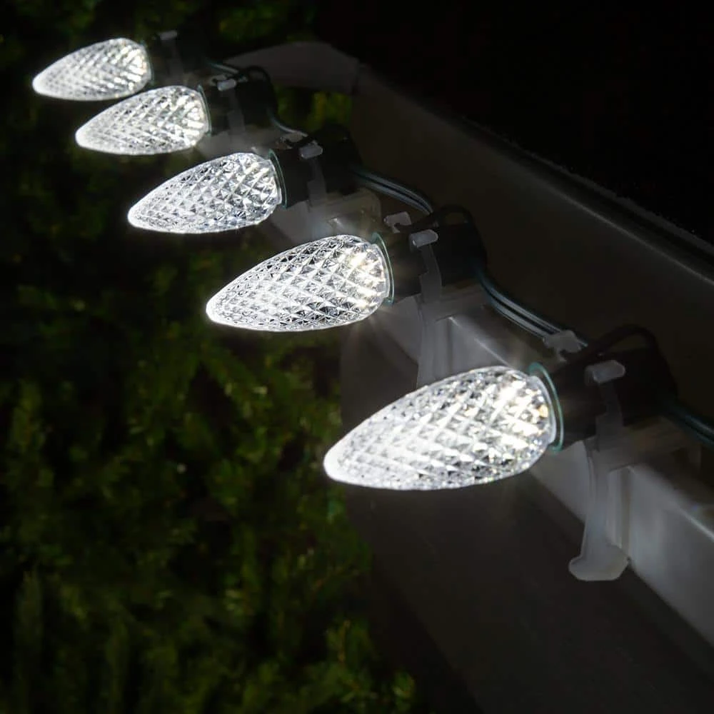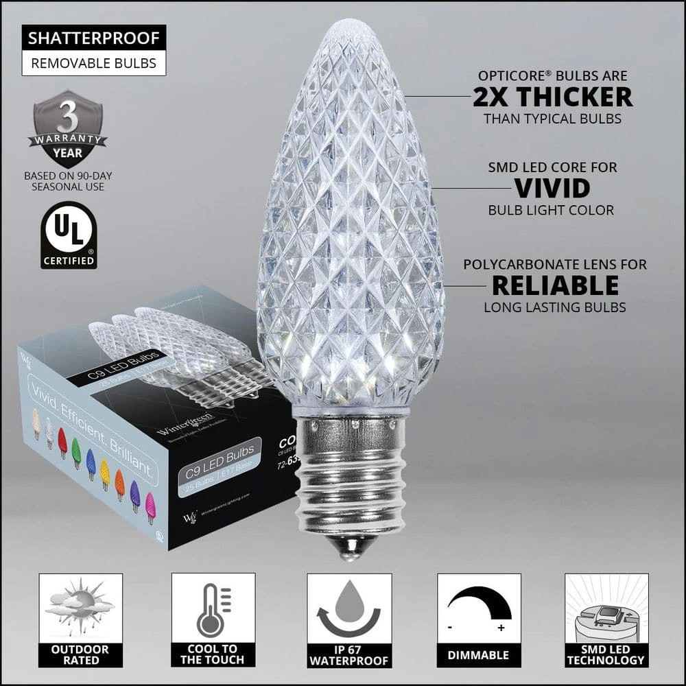 - Box of 25 C9 cool white faceted OptiCore LED Christmas light bulbs, E17 base; fits any standard C9/E17 stringer socket