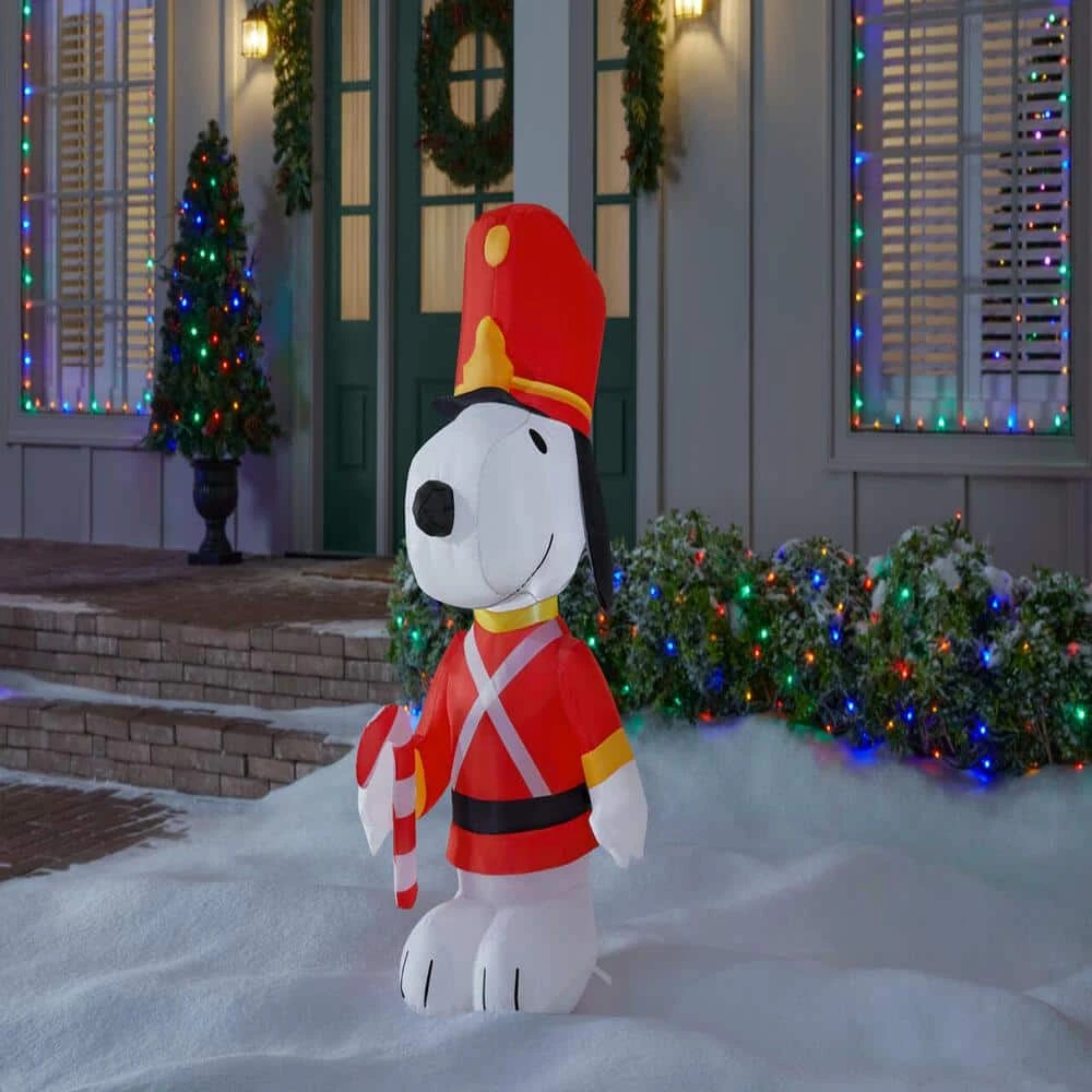 Celebrate the merriest season of all with this Airblown Snoopy as Christmas toy soldier inflatable. The adorable beagle dons a spiffy red soldier’s uniform and cap to kickstart the holiday merrymaking, enhancing your vibrant outdoor decor. White LEDs help liven up your yard at night, and the self-inflatable design allows for quick, fuss-free setup. Use the included tethers to secure your outdoor installation. At 3.5 feet high, this Airblown Snoopy as Christmas toy soldier inflatable works as a standalone decor or as part of a fun custom holiday scene.