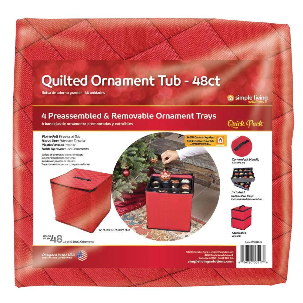 Use the Premium 48ct Quilted Ornament Storage Tub to store and protect 48 of your most special ornaments that are up to 3in in diameter. This flat-to-full structured tub with a heavy duty quilted polyester exterior, and plastic-paneled interior, includes 4 preassembled and removable ornament trays and a convenient carrying handle. This ornament storage tote is made of our high-quality water-resistant quilted polyester that will protect your special ornaments from dust, debris, and damage!