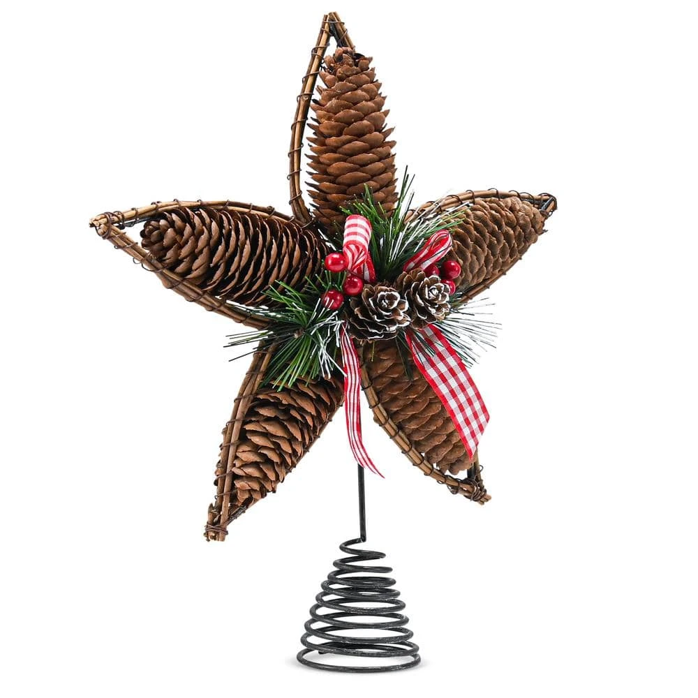 ORNATIVITY Rattan Tree Topper Ornament comes set up. The topper will add a holiday feel to your home decorations. The Rattan Star measures 11.5 in. x 9 in. This tree topper includes a rattan Christmas tree star topper and a spring base. It is a 5 point star, made out of branches, with big acorns wedged in between each star point. In the center, there are green mistletoe leaves, faux red berries, small frosted acorns, and a red bow made out of gingham ribbon. The star has a spiral tree attachment that will provide a secure tree attachment for any size tree. This tree topper works well for rustic themes, farmhouse themes, winter themes, and candyland theme Christmas decorations. This tree topper works well with wooden garlands, faux snow decorations, metal tree skirts, and other rustic decorations. This tree topper will add to the Holiday feel of your home, along with your other Christmas decorations. Bring the Holiday vibe into your home with this cool decoration. This topper can coordinate with your fall themed yard decorations, so you can set up your Christmas tree in your yard long before Christmas. This ornamental masterpiece is the perfect addition to your Christmas tree top.