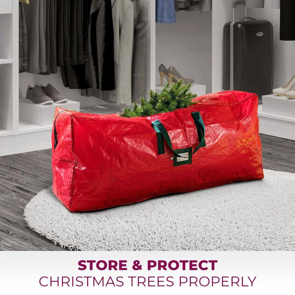 Nothing enhances the living room like a freshly-scented Christmas tree, and we want nothing more than keeping it that way for many seasons to come. The only way to achieve that is by keeping it protected in storage amongst the dust-mites, bugs, and mold. In that case, you have come to the right place. Bag is of waterproof material for insurance against water damage; 2-way tightly-zipped dual zipper prohibits any type of basement residents from invading your x-mas tree. And about the transference between storage and living room, bag is equipped with stitch-reinforced carry handles and side handles for added accessibility. Name the type of tree in the designated card slot. And for a little extra dazzle to the holidays, bag comes in a couple of bright, festive, holiday colors. With all these handy and practical features, packing and unpacking trees are now easier than ever.