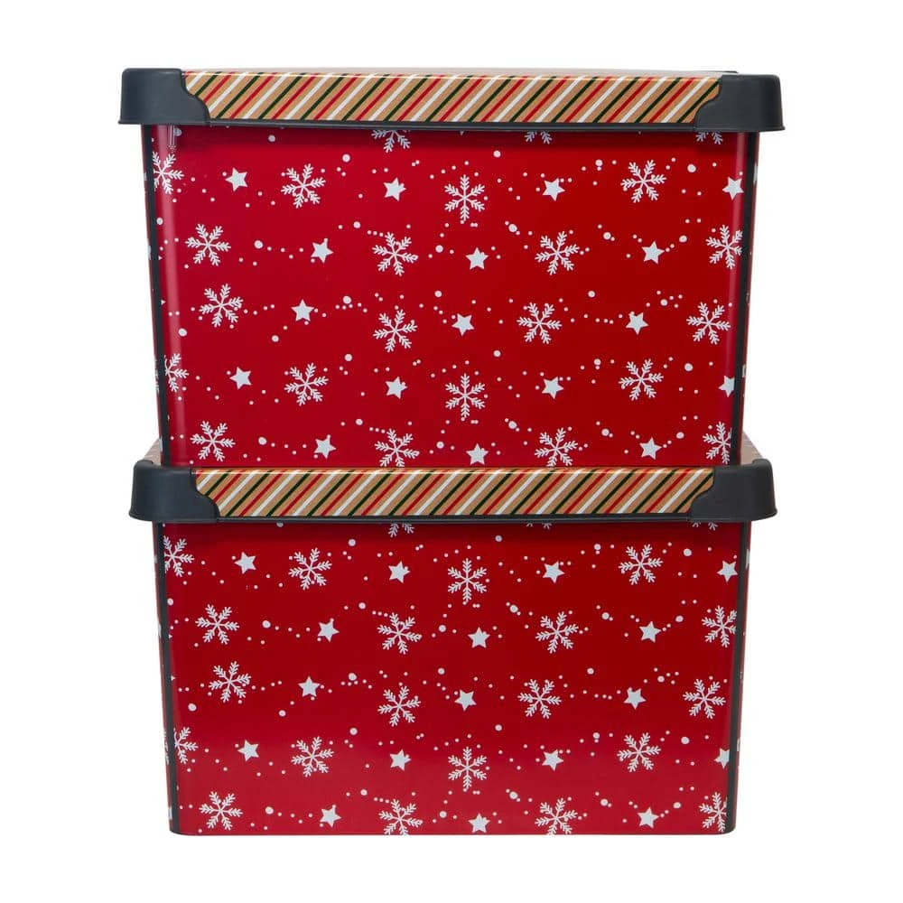 Keep your precious holiday decor safe on the off season with the Simplify Holiday festive storage tote bins The plastic material allows the storage bin to protect what’s inside from being crushed, dust, odors and water. Stackable design allows you to maximize your storage space, removable lid makes it easy to pack and unpack your items. The festive holiday print allows you to use for more than just a storage box, can be used as a big gift box or a holiday basket.