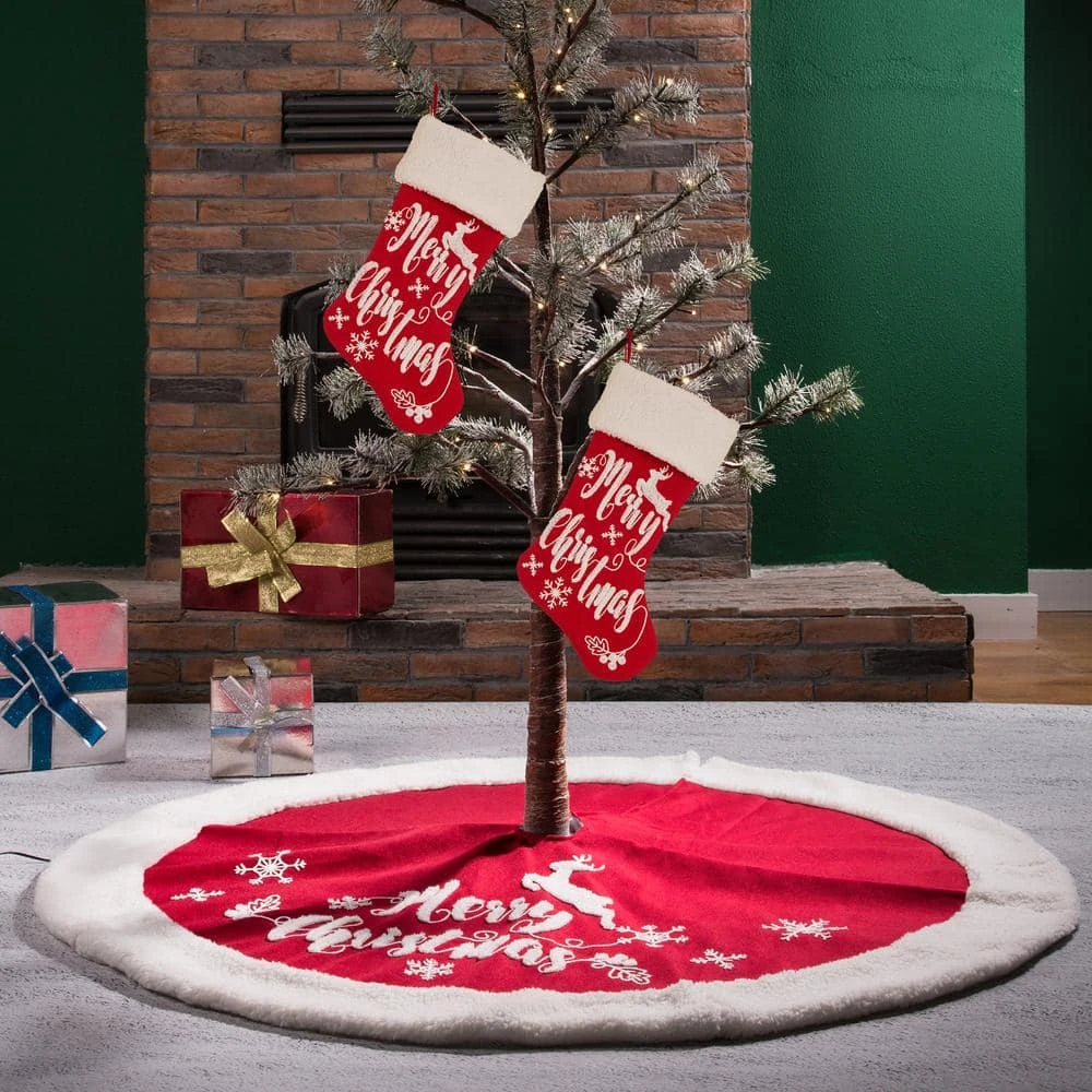 Fabric Christmas Decoration group including 1 skirt and 2 stockings well matched with each other, a great additional set for your Christmas tree, red and white in color for confirmable feeling to warm up the atmosphere and space, cannot miss it at the big-day. Washing instructions: Cold water wash. Do not iron. Use stain/spot remover if needed.