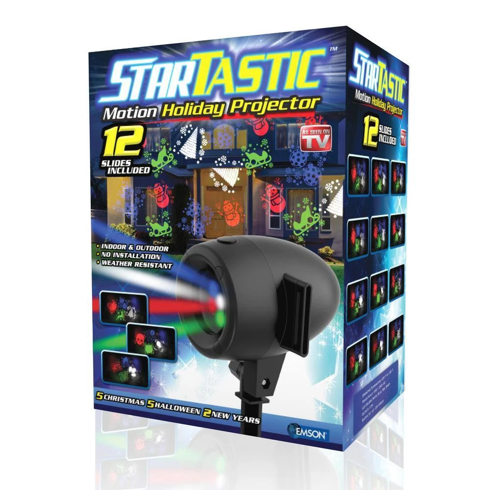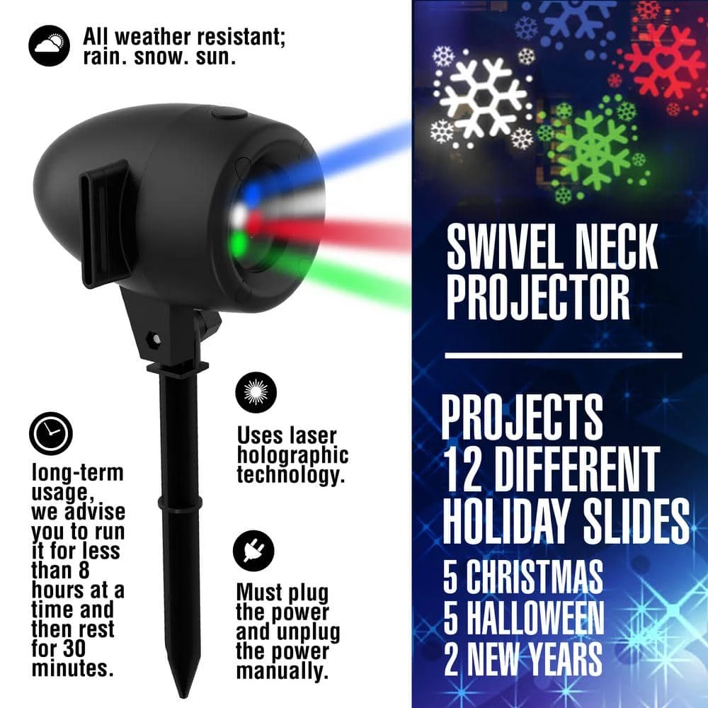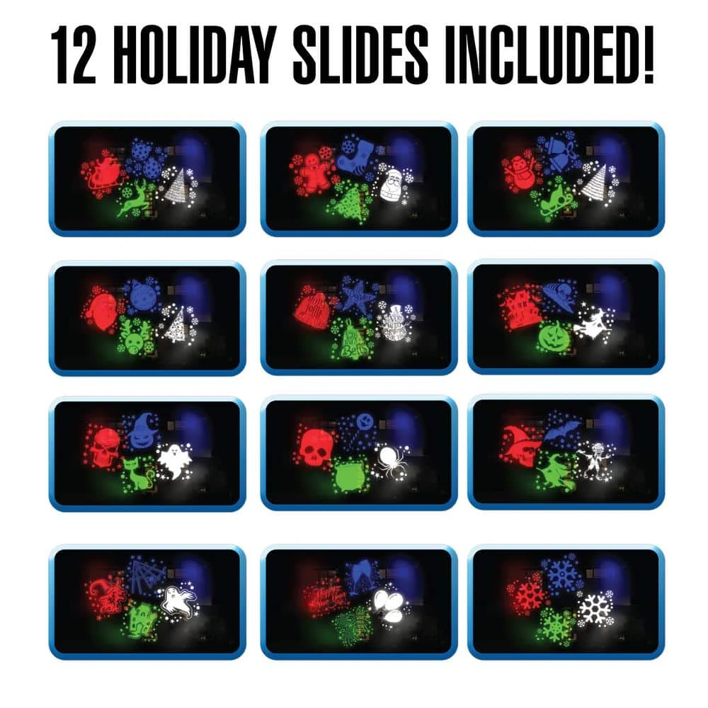 Startastic Holiday motion projector the all in 1 holiday light solution. This outdoor laser projector is an easy way to light up your home and garden for any party occasion especially Christmas and New Year’s. No more climbing up ladders and hanging string lights for hours – just plug in. Choose from over 12 different holiday slides. 5 Christmas slides, 5 Halloween slides and 2 New Year’s slides.