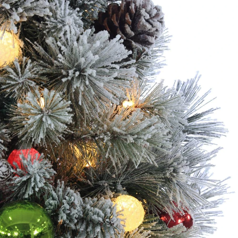 Enjoy the seasons this year with this one of a kind LED Lighted Flocked Hard Needle Pine Christmas Tree. Each of these Christmas Pines stand at 4.5 ft. Tall, and are supported by strong support poles and sturdy base. 100 Clear LED micro lights surround this tree, and allow it to shine through in and throughout. This tree is also equipped with pine cones and shatter proof ornaments. Additionally, 50 UL Listed G40 Glass Bulbs with LED Lights have been added to this tree as well. Pre-Lit Christmas trees give you more time to live in the season and spend your time on what matters most.