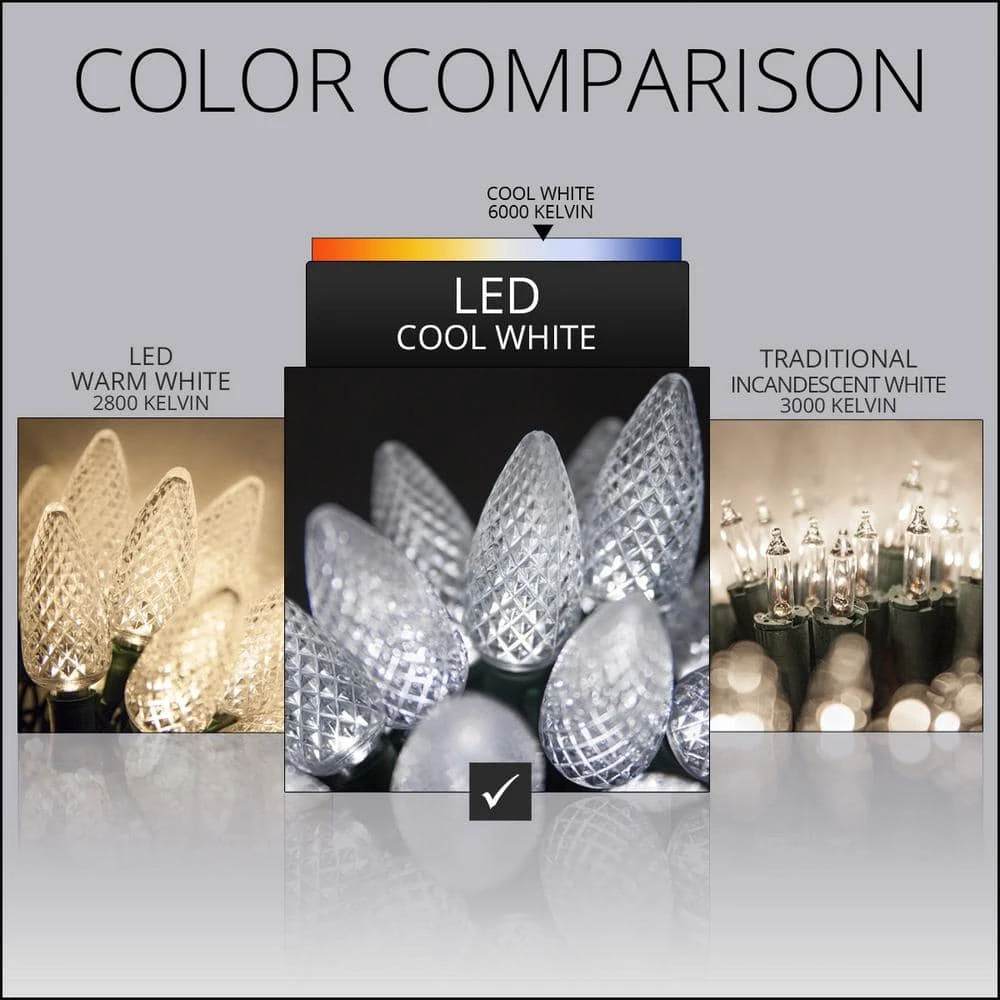 - 25 cool white C9 LED lights spaced 8 in. apart on green wire, 6 in. lead with fused stackable male plug, 6 in. tail with female plug for end to end connections, 17 ft. total light set length