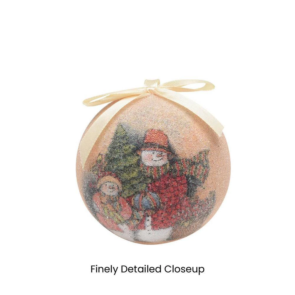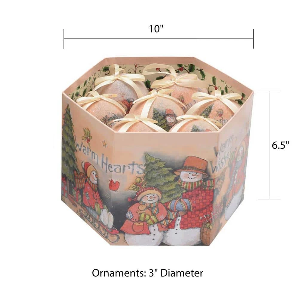 These old-fashioned snowman illustrations will warm your heart, even in the coldest winter. Quaint snow family extends warm wishes to all. Beaded glass, lightly frosted ornaments feature soft, muted tone illustrations of snowmen and are complete with ivory color ribbon ties. Each set of 14 features a variety of ornament designs and includes a designer gift box that doubles as storage for safe keeping. Celebrate family memories with these affordable, quality ball ornaments. Each individual ornament is 3 in. Dia x 3-1/2 in. H.